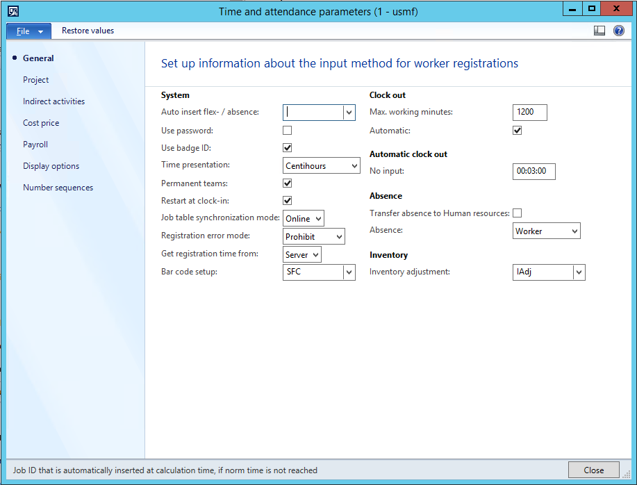 Max work minutes are set and automatic clock out is set to limit the time registered if the user forget to clock out.