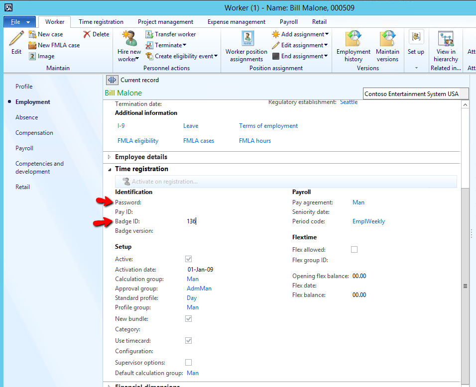 Password and Badge Id I some times use. This is set up on the employee settings (Human Resources > Common > Workers > Time registration workers | Employment > Time Registration).