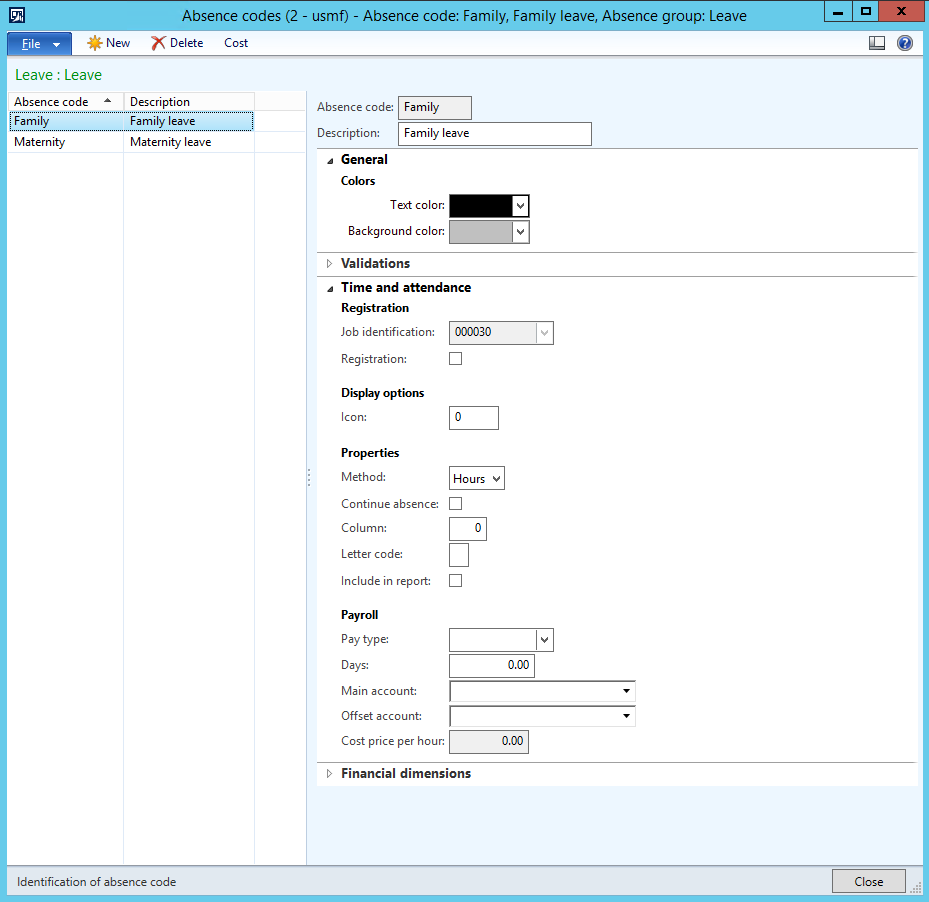 The setup for absence codes are the reasons for why the employee is not present. Not all the codes are natural to have in the terminal Interface. To make them available. Tick the “Registration” checkbox under Time and attendance fasttab.