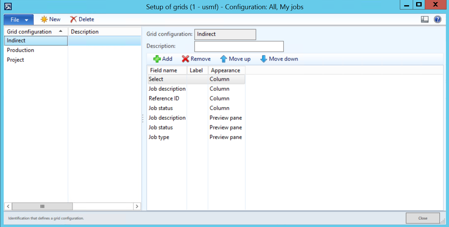 You can select the setup for the Indirect activities, Production orders and Projects. You can configure these and choose what fields to be shown in the grid collumns and the preview pane.