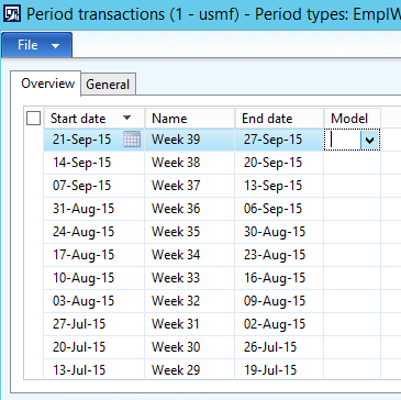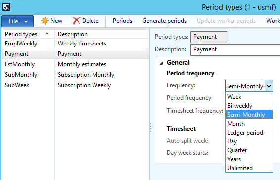 After pay types are created and approved there will be payment lines ready for transfer. The records for payment lines are created and there is a flag on each post showing weather or not the transaction has been exported. When transfering payments from AX we use a periodic grouping by the means of period types. This is a shared feature between many different modules and situated in the Project module. You can create your own periods and can choose from a set of different types of period intervals. I normaly use the ledger type, but have created some weekly or monthly offset types of payment periods. Workers can be grouped to different payment periods. It is then possible to do different exports for different workers, so in some cases you might even have similar period types with different names (for instance if exported to different systems, but in similar periods).
