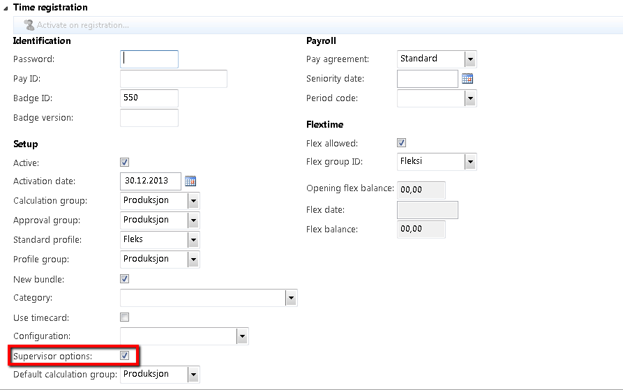 To activate this feature for the terminal user. Go to Human Resources > Common > Workers > Workers | Employment > Time Registration > Supervisor Option and check the box.