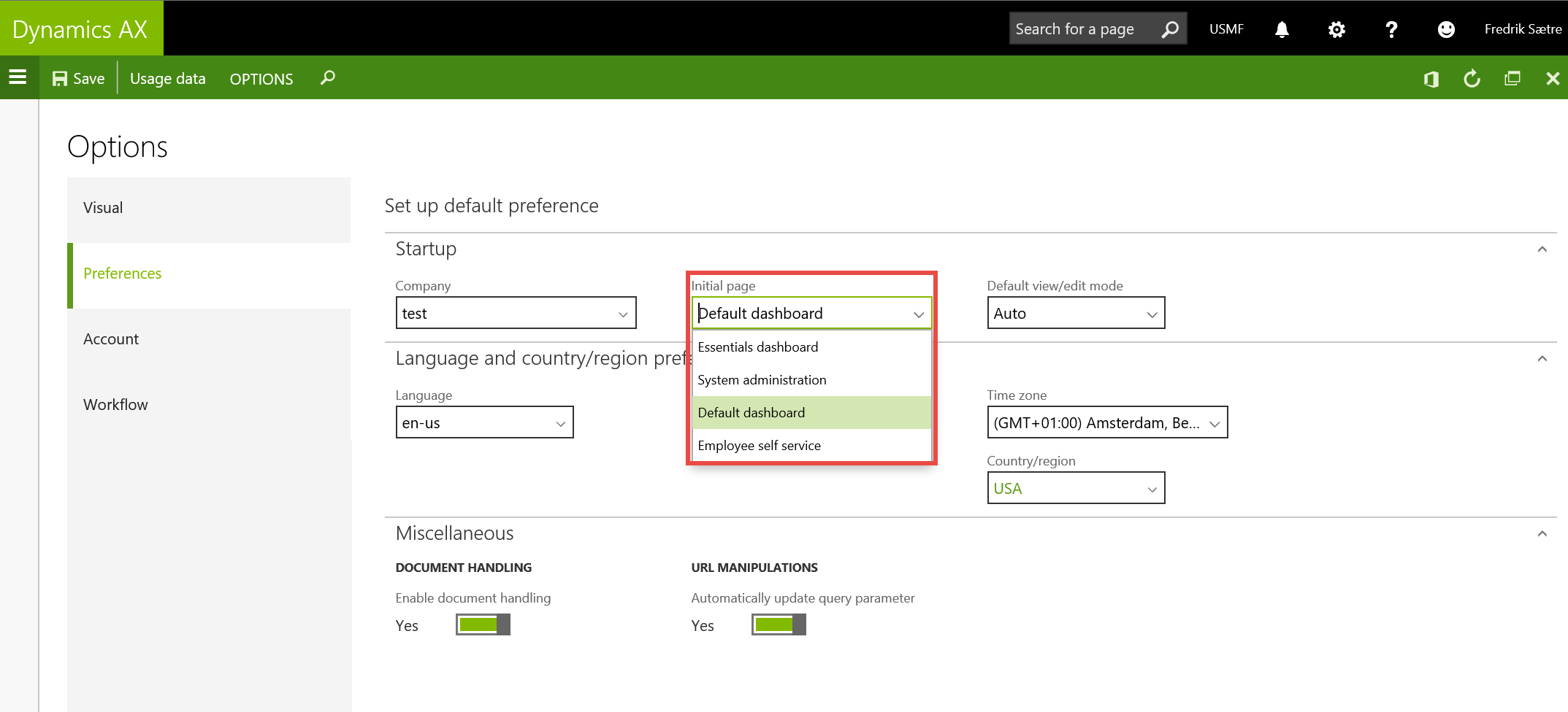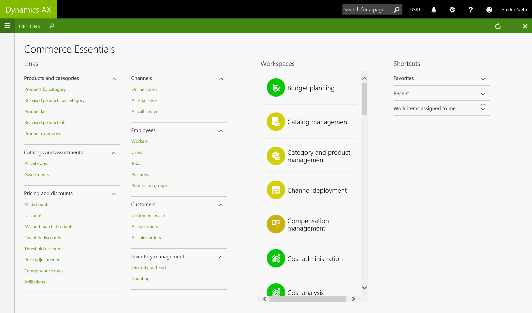 In addition to having the favorites and workspaces (To the right) you have a set of menu items that gives all access to what you need in setting up commerce in AX. Mostly used in retail, but not necessarily so. Can be used by a lot of other functions as well. Remember: You can remove things you don’t want very easily.