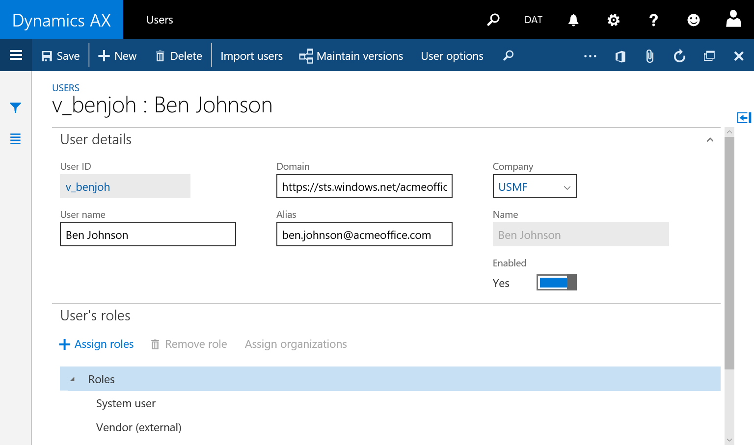 Go to the System administration > Users > Users and add a new user. In the “Name” field you enter the contact person name and add the “Vendor (External)” role to the user.