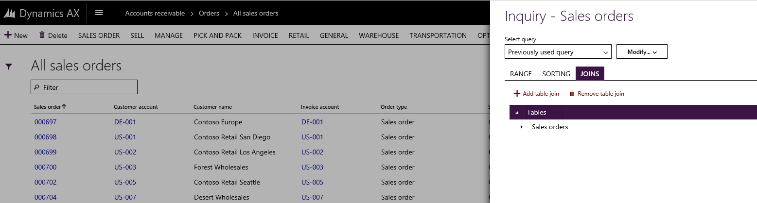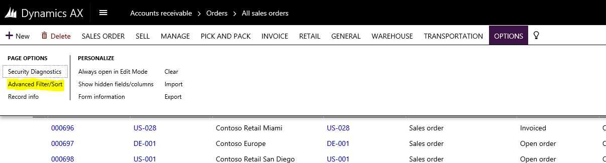 The good thing is that the advanced filter dialogue still is available that we know and love from earlier versions is still available. By going to Options in the top menu and clicking Advanced filter/sorting you’ll access this familier AX filter options dialogue.